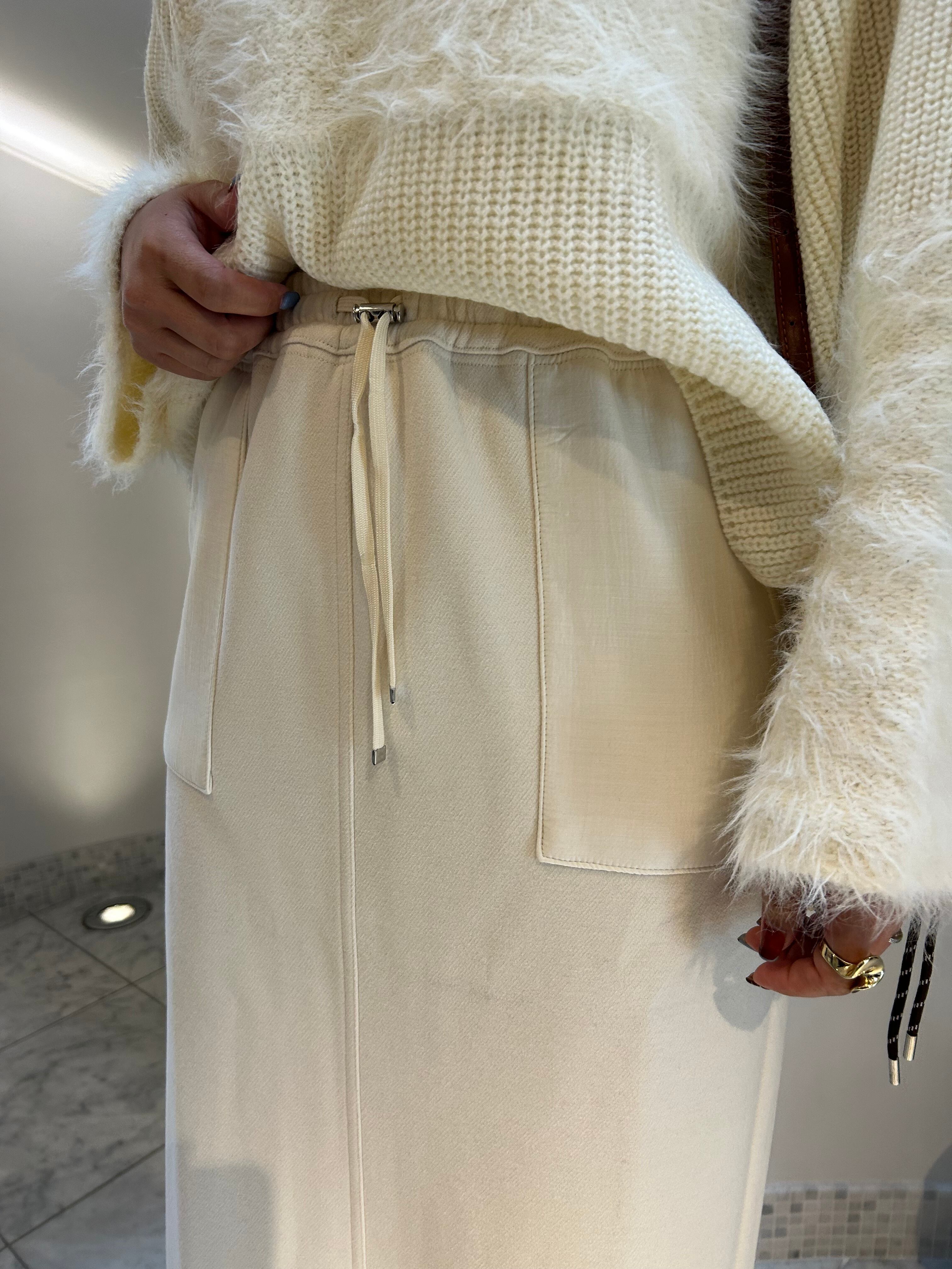 ウエストゴムとドローストリングでリラックス感のある履き心地を叶えつつ、すっきりとしたIラインシルエットで大人っぽく仕上げたタイトロングスカート。