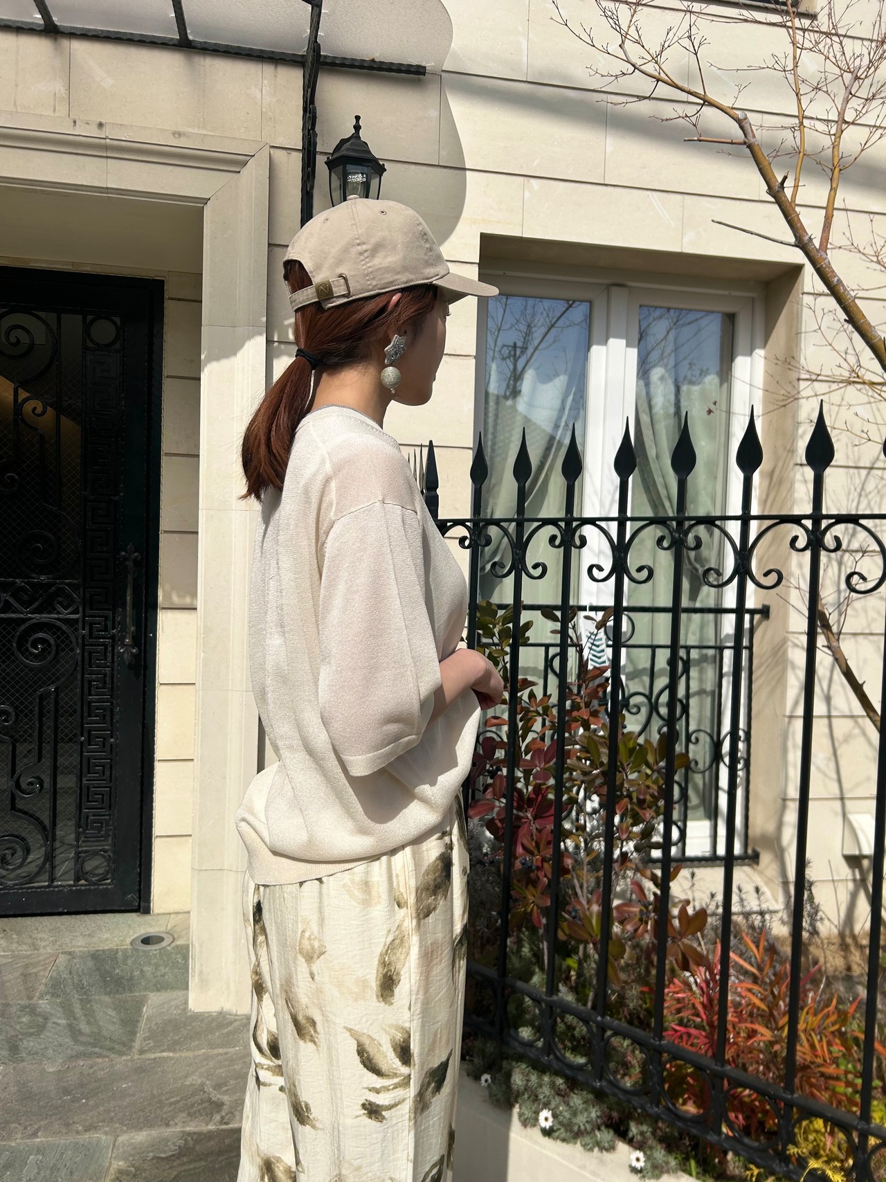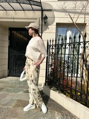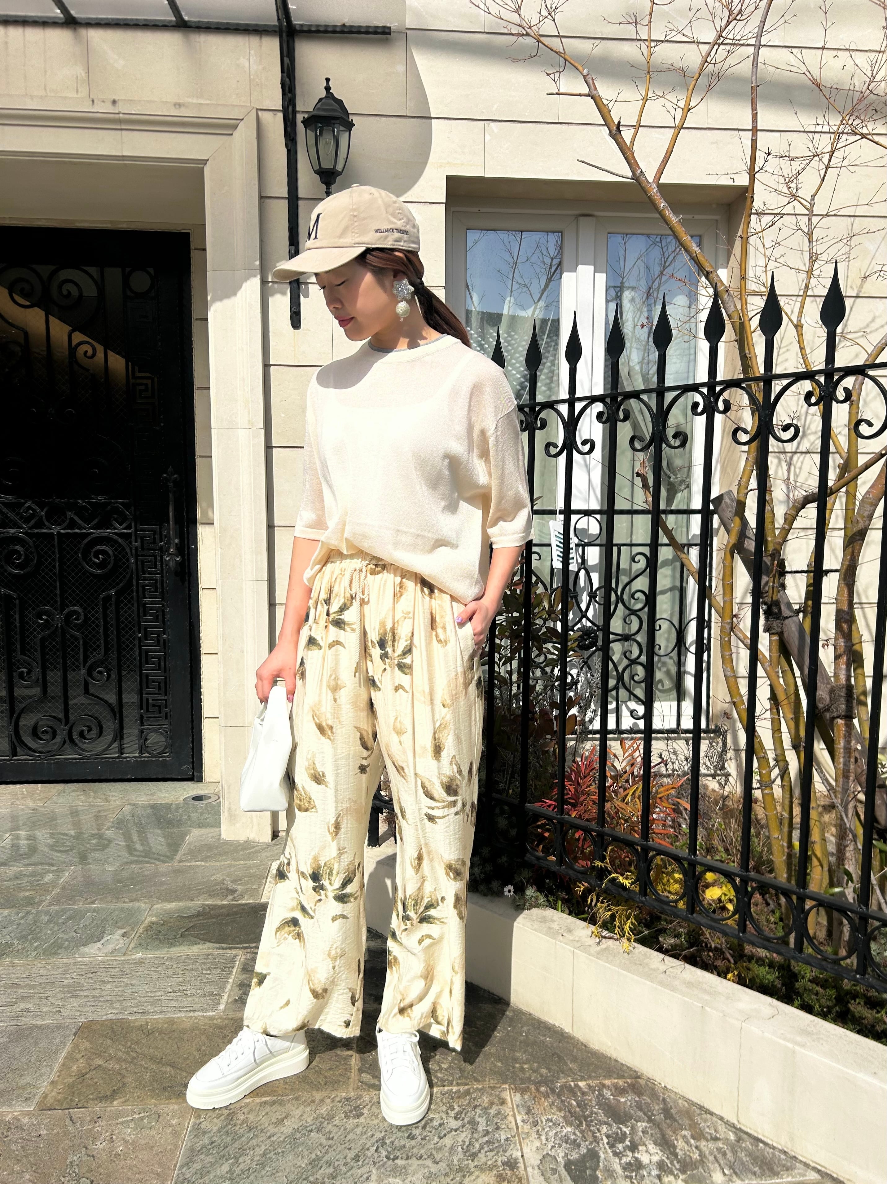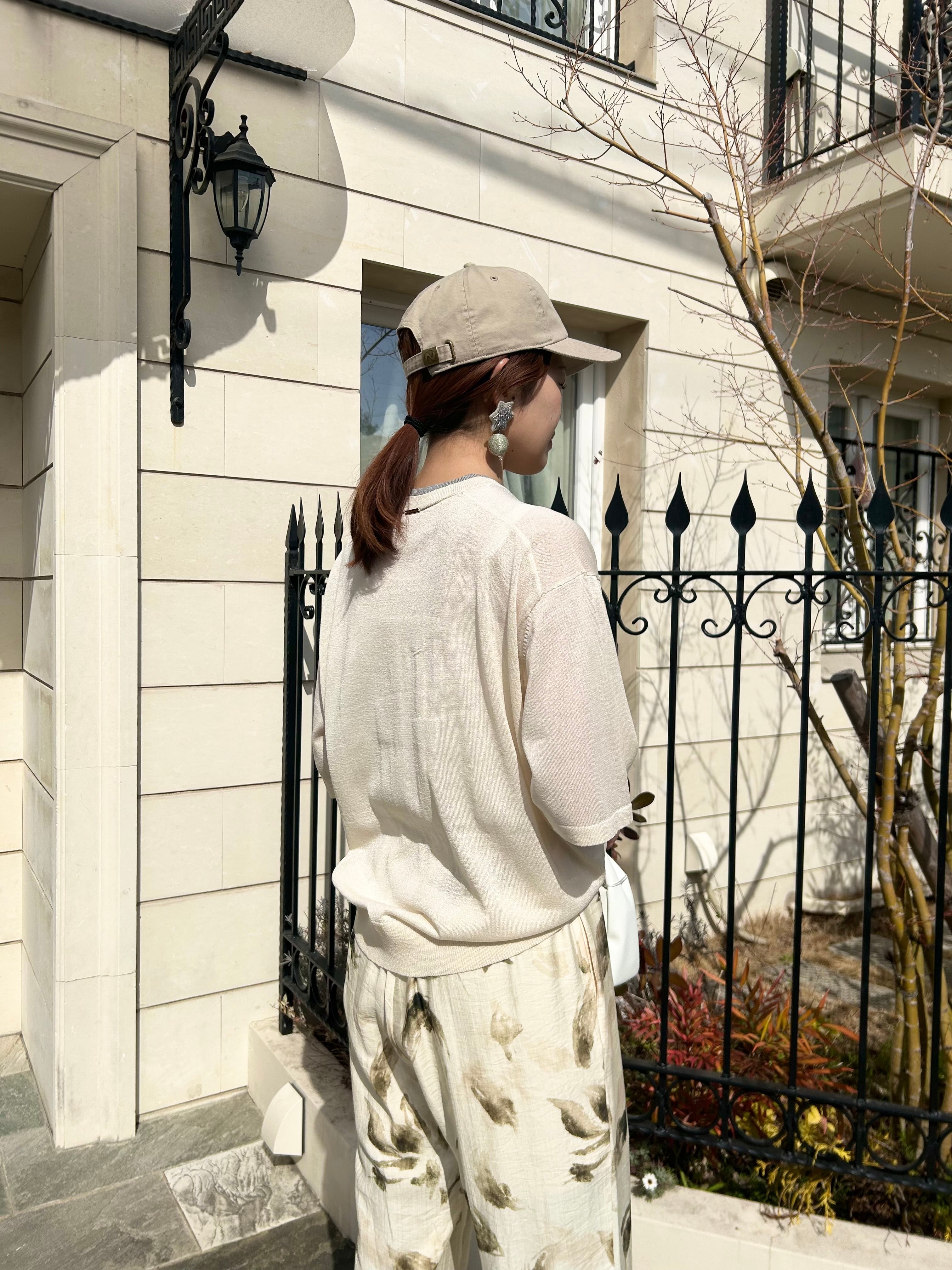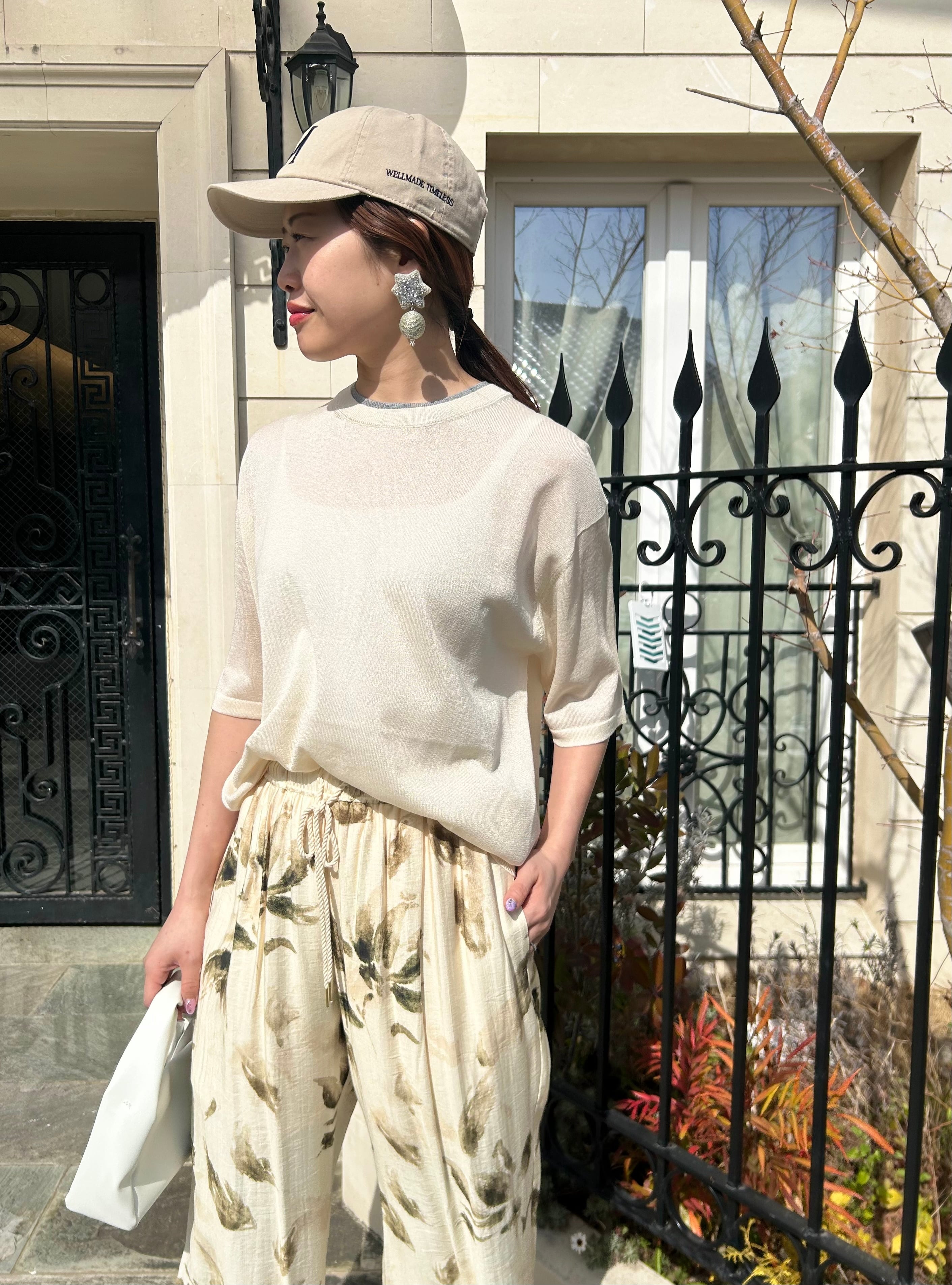 詰まり気味の衿ぐりと、ゆとりある身頃、肘が隠れる5分袖丈で、抜け感あるシルエットになっています。
