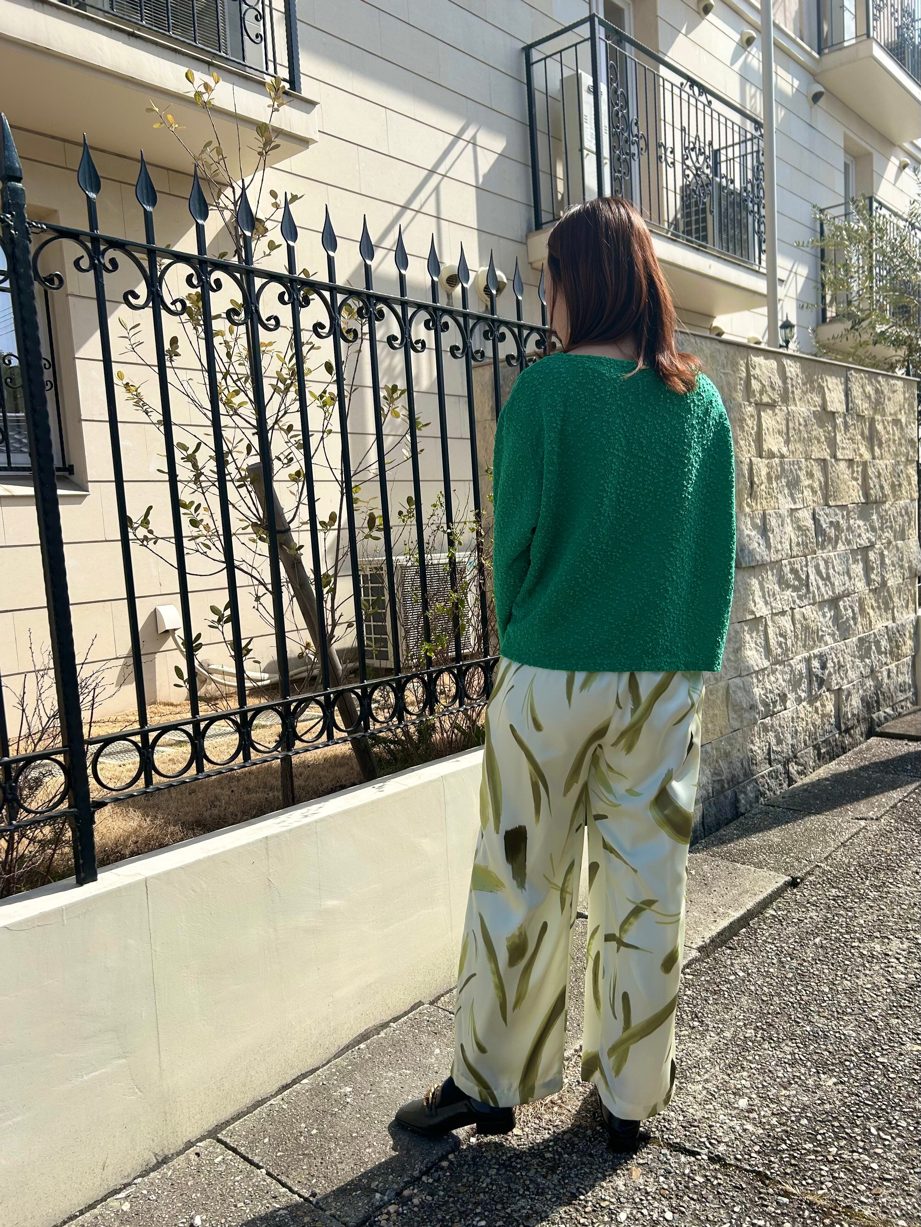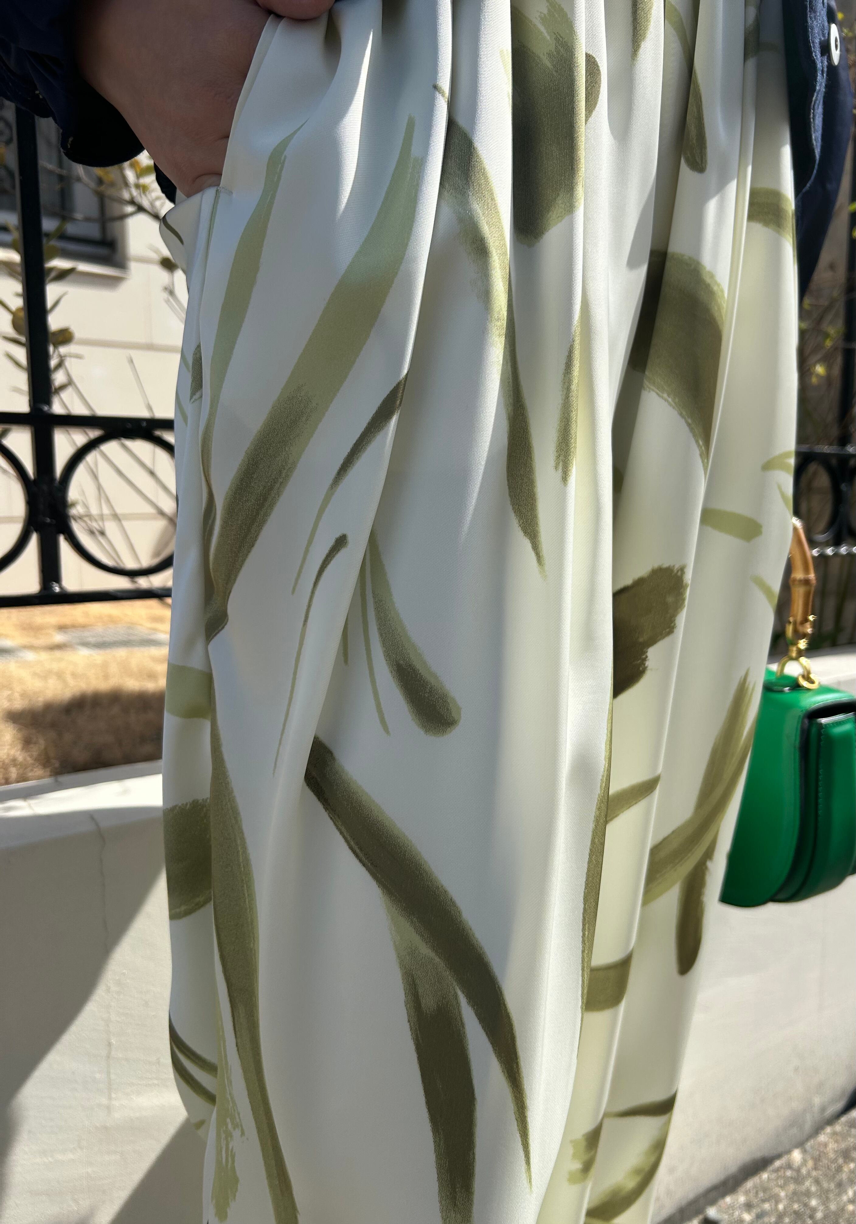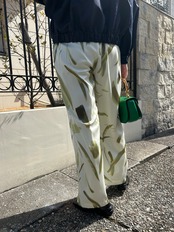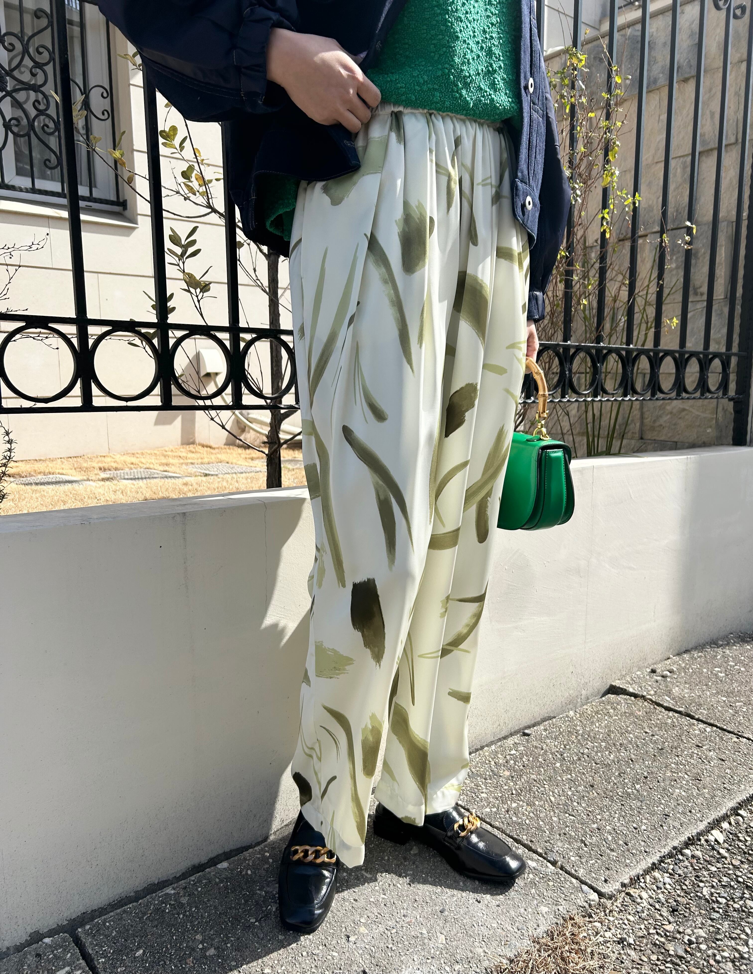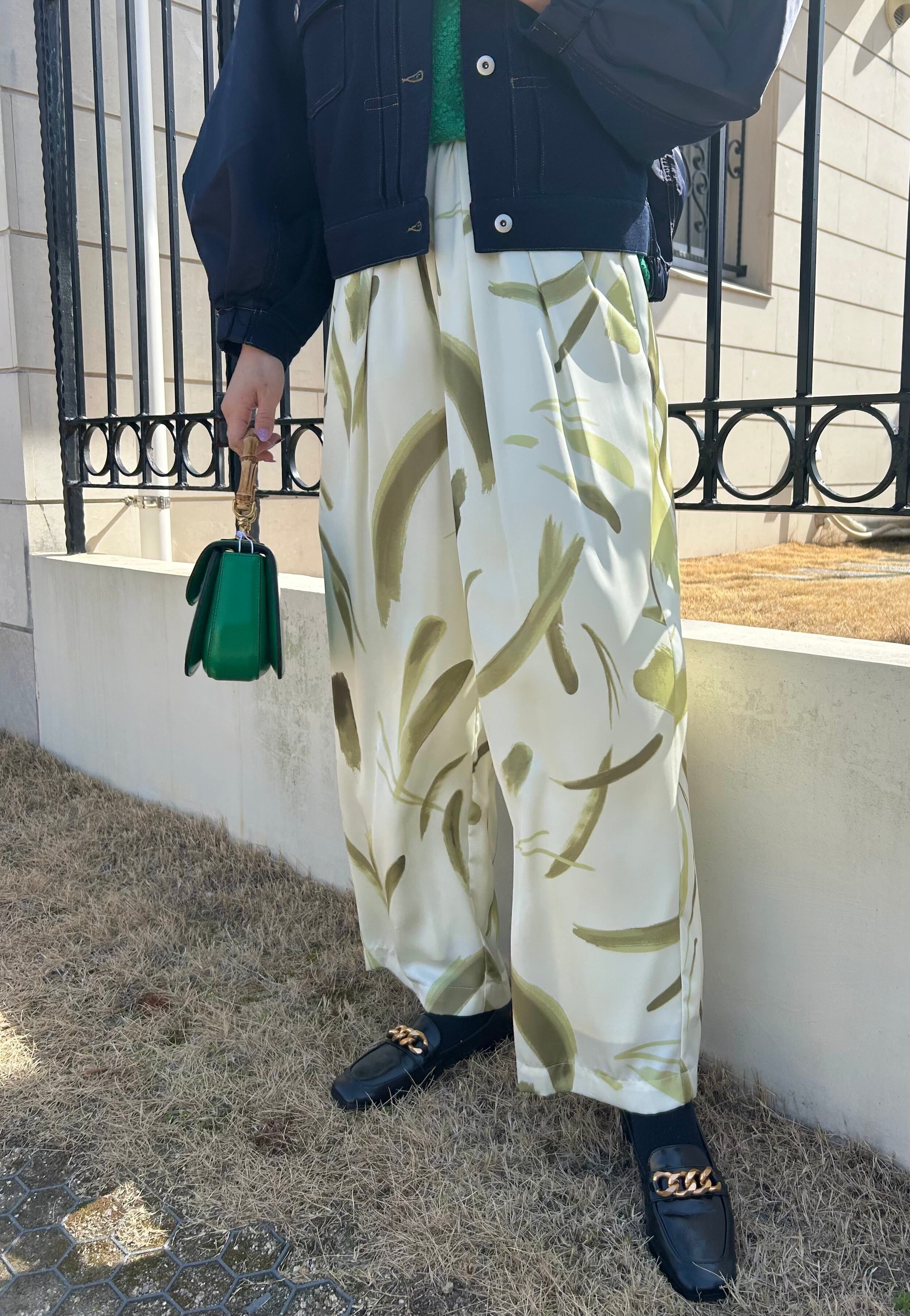 手書き風の大判な抽象柄が目を引く、サテンタックパンツです。