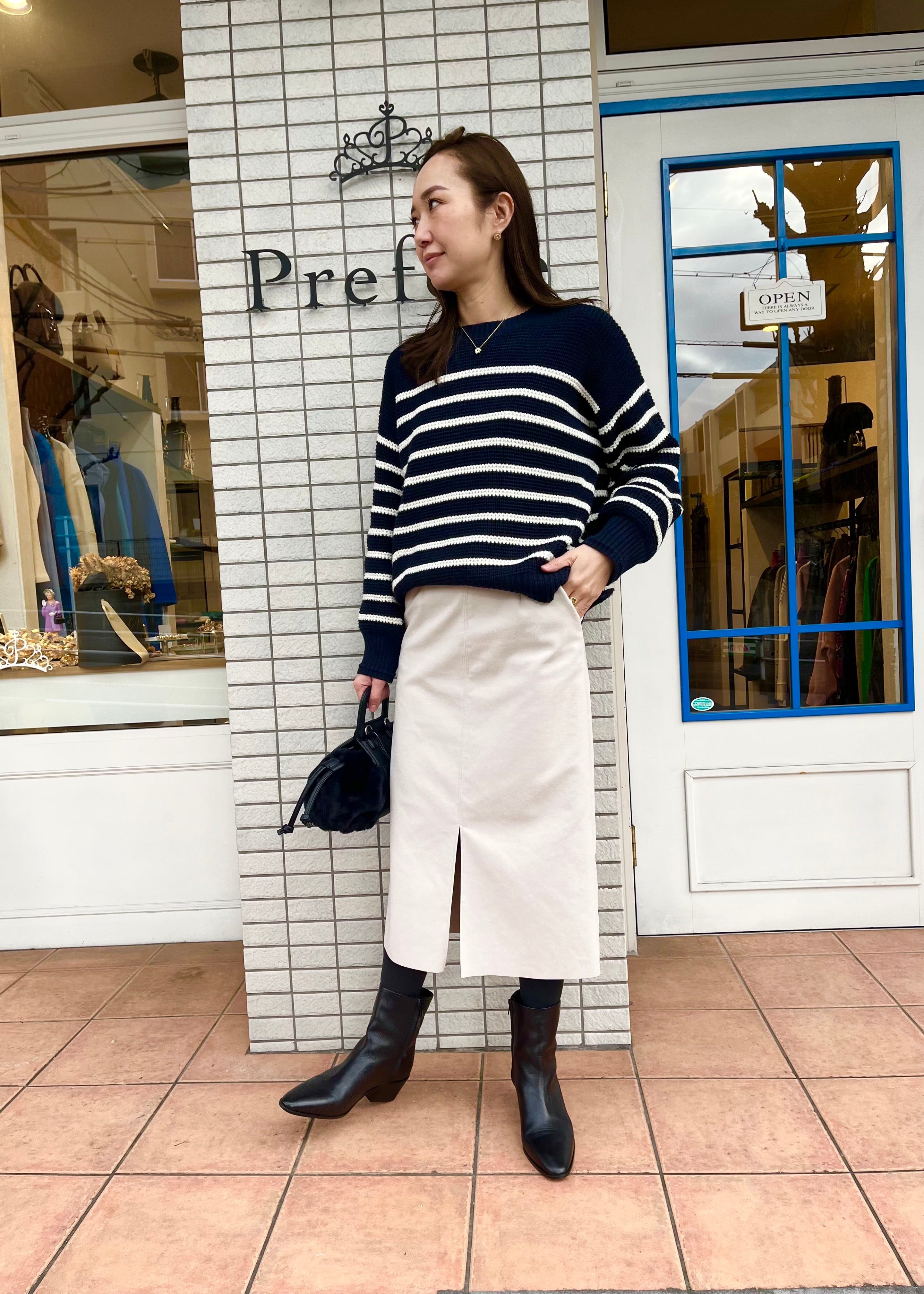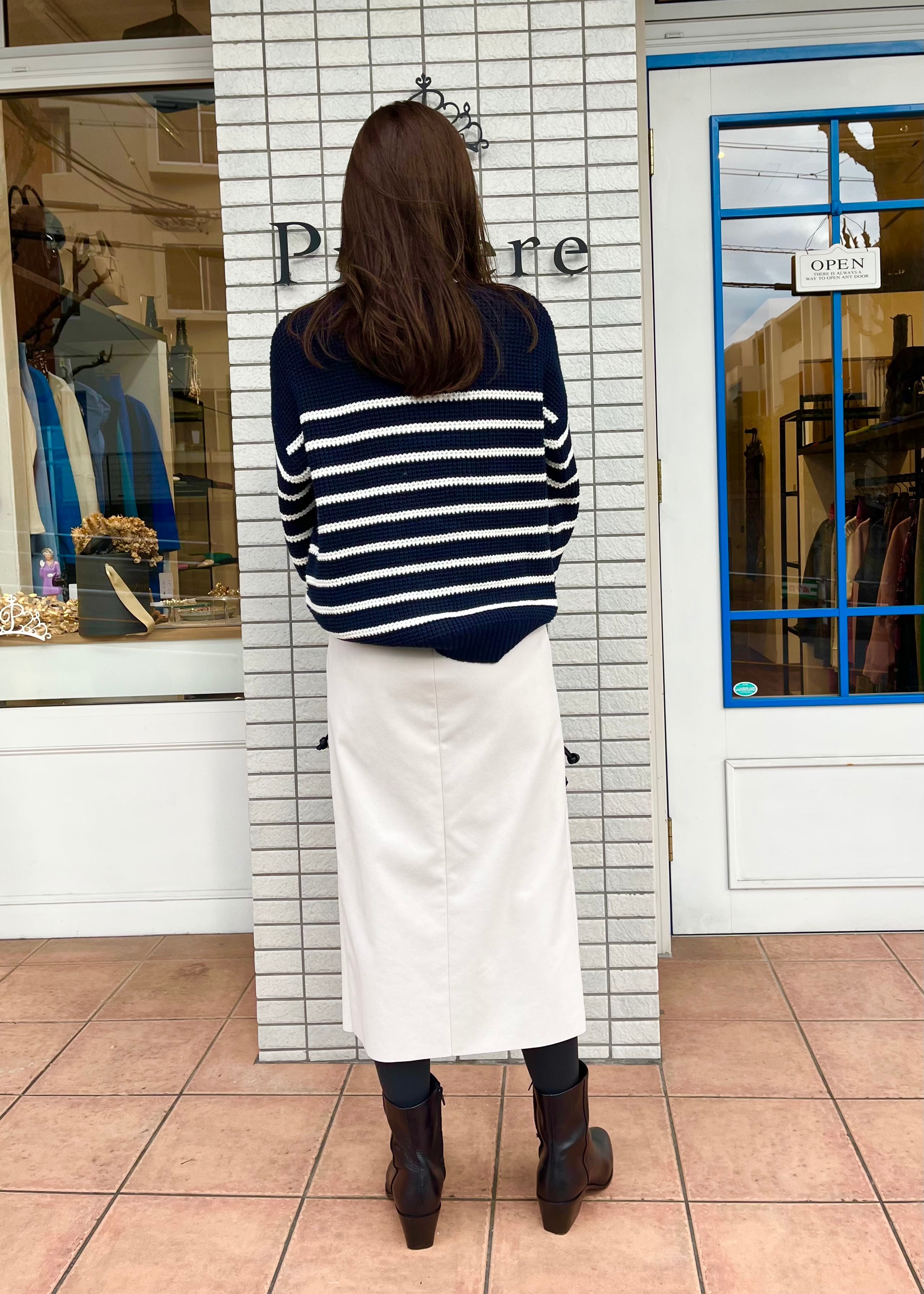腰のフラップがポイントになっており、シンプルなのでトップスを選ばず、1枚でお洒落に見えます。