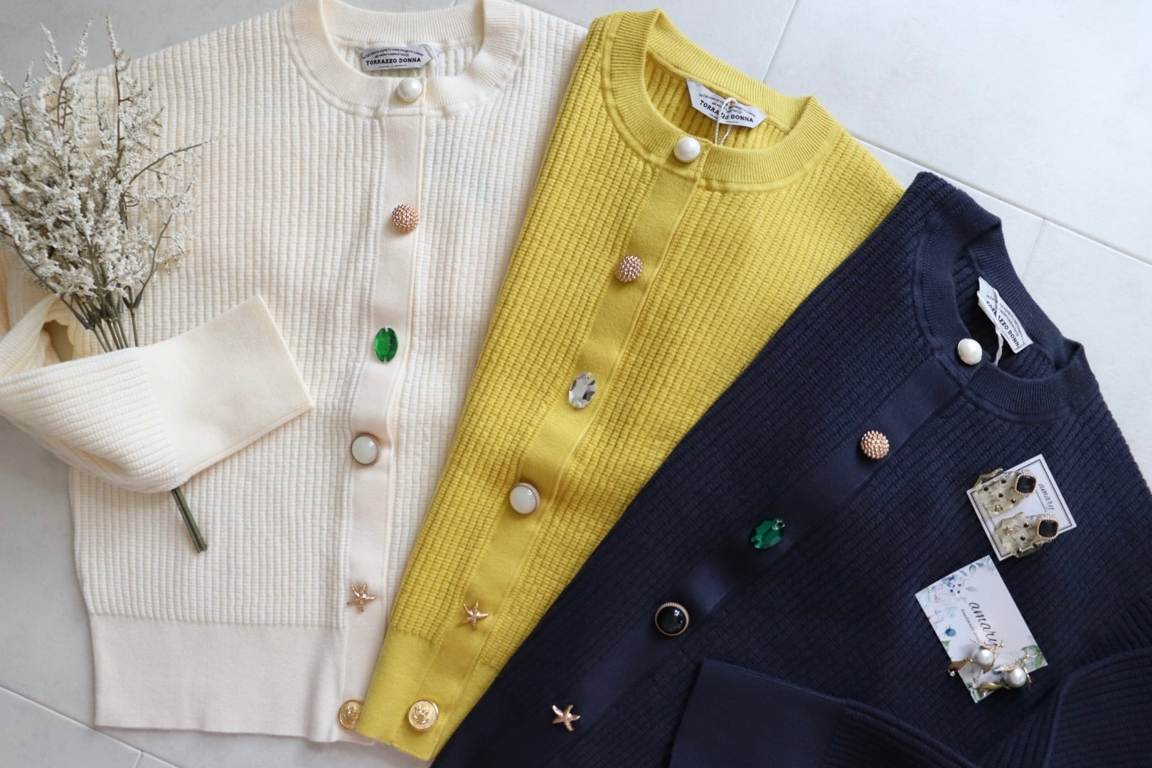 毎年人気のワッフル風編みビジュカーディガンが登場。