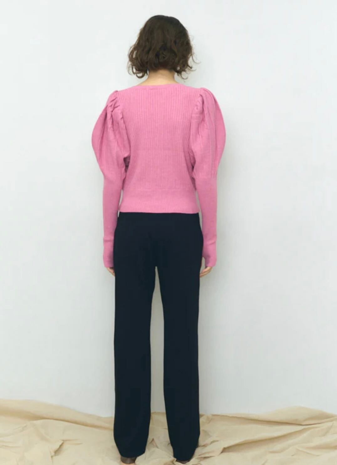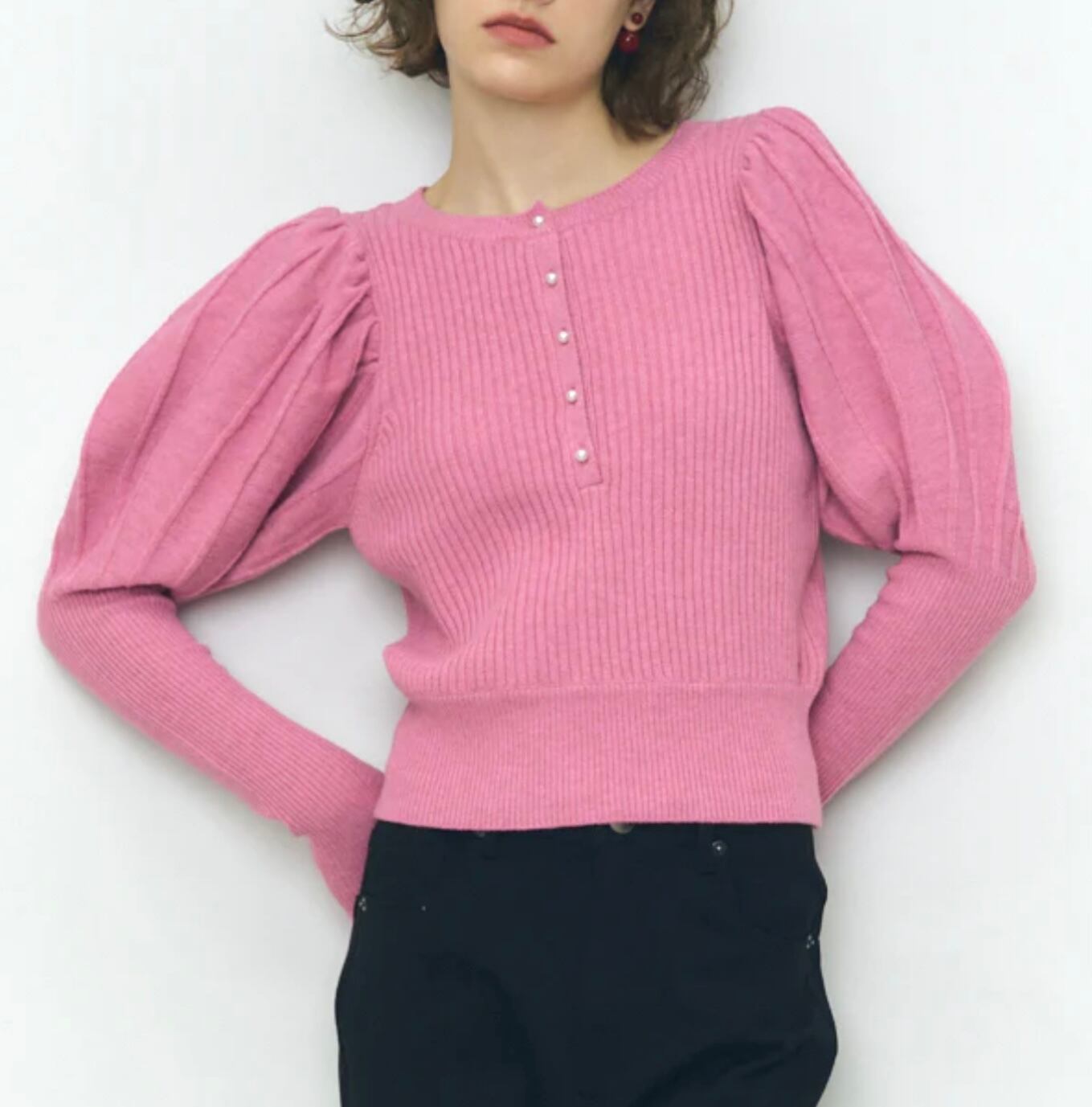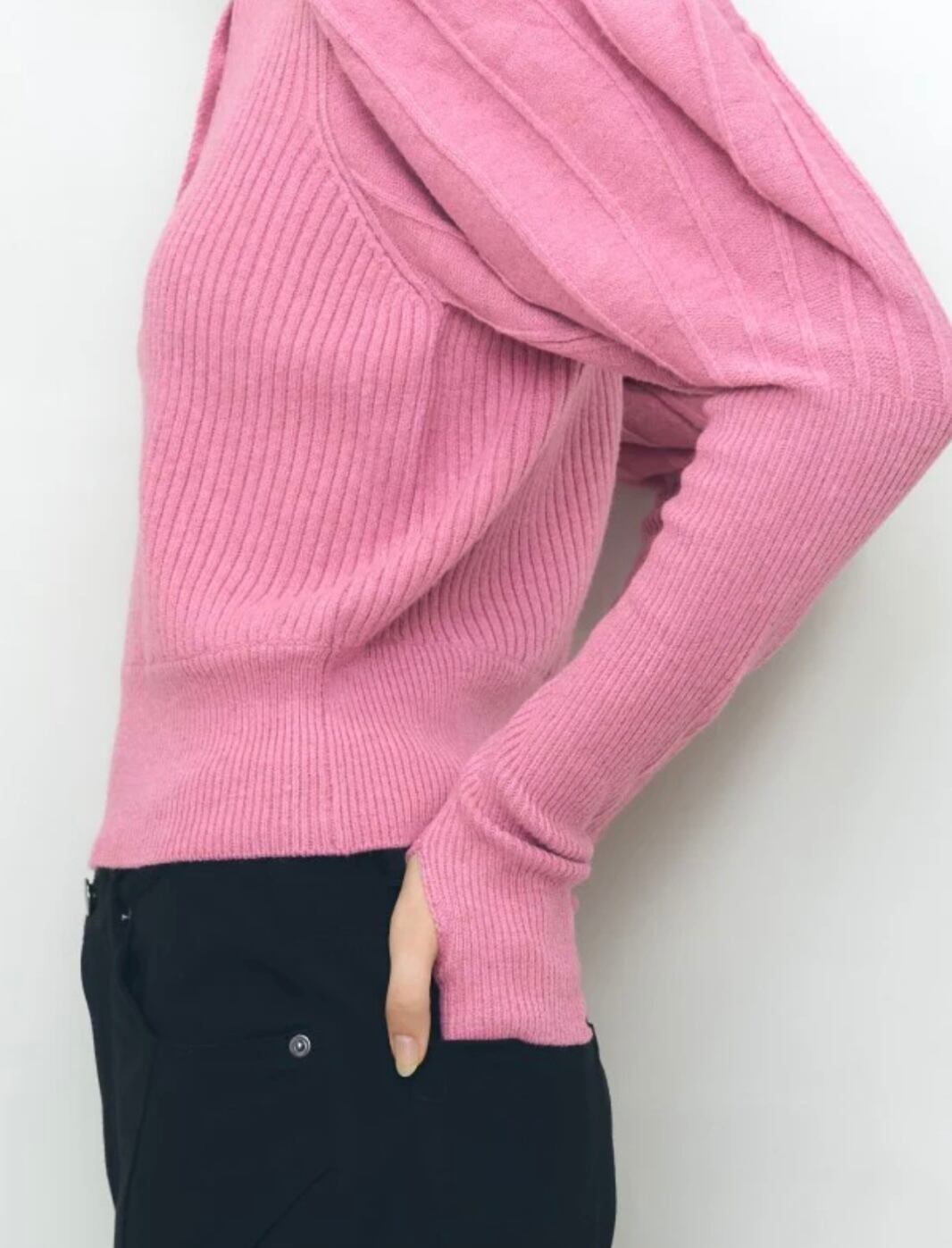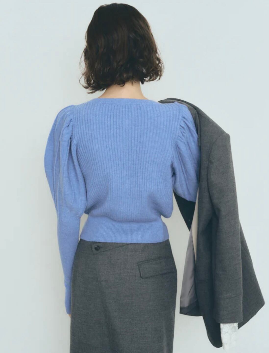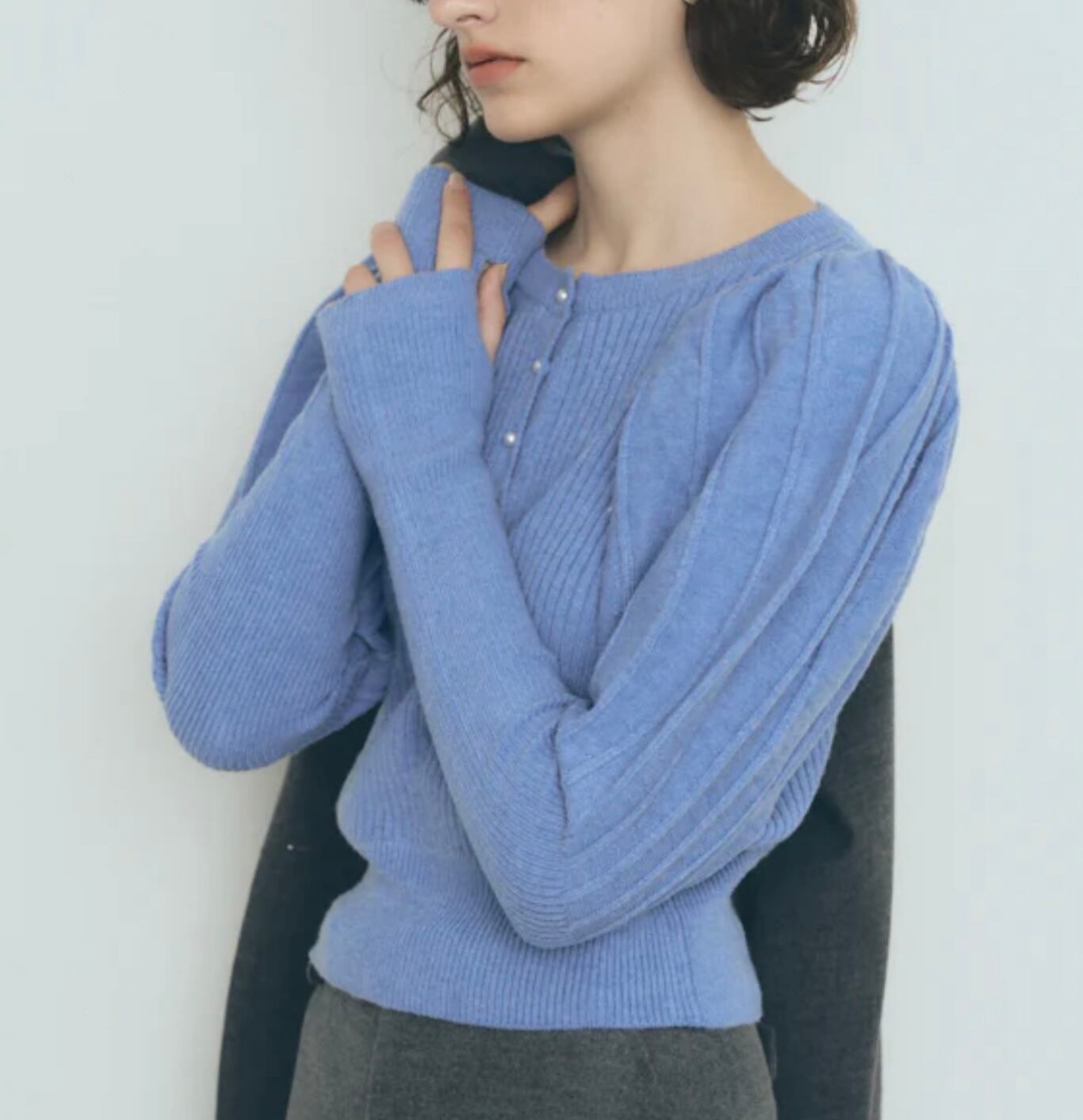 程良いパフショルダーから袖口に向けてタイトなリブシルエットになり、袖口は甲を覆えるように親指を出せる仕様になっています。